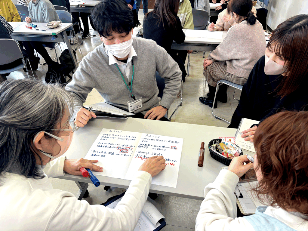 そして、その「15分間のお喋り」に、どんな意味があるのか?を考えるグループワークを行いました。様々な意見が上がり(中には図式化して熱弁する方も!)午前中の保育と重ね合わせながら「この対話にワクワクする保育の鍵があるのでは?」ということが見えてきました。